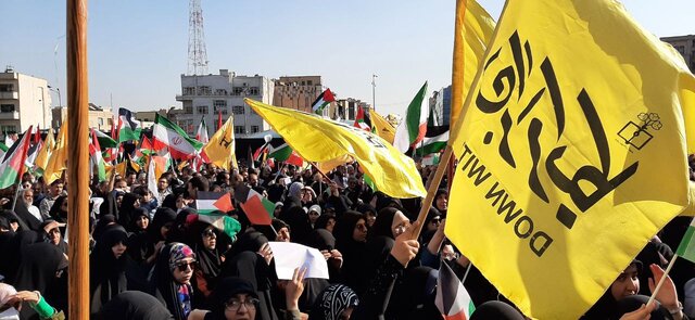 مردم تجمع کننده با پرچم‌های حزب‌الله، فلسطین و ایران در میدان انقلاب حاضر شدند.